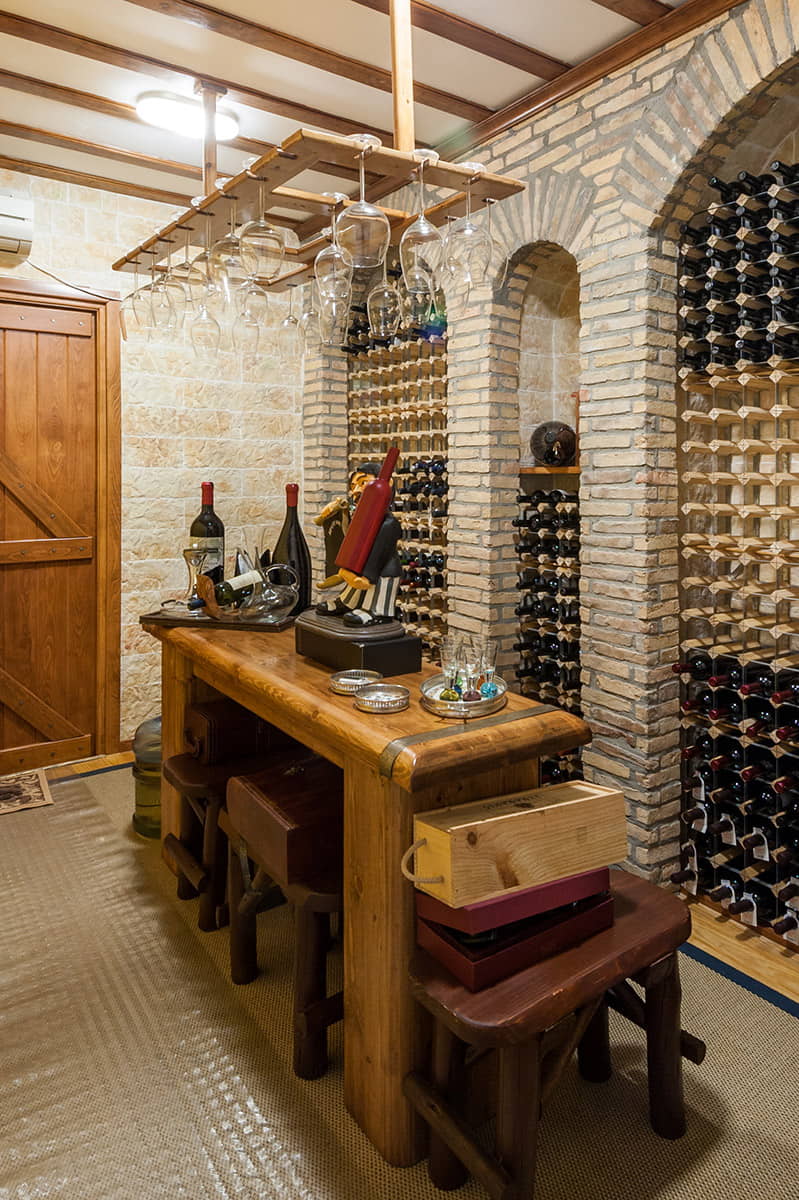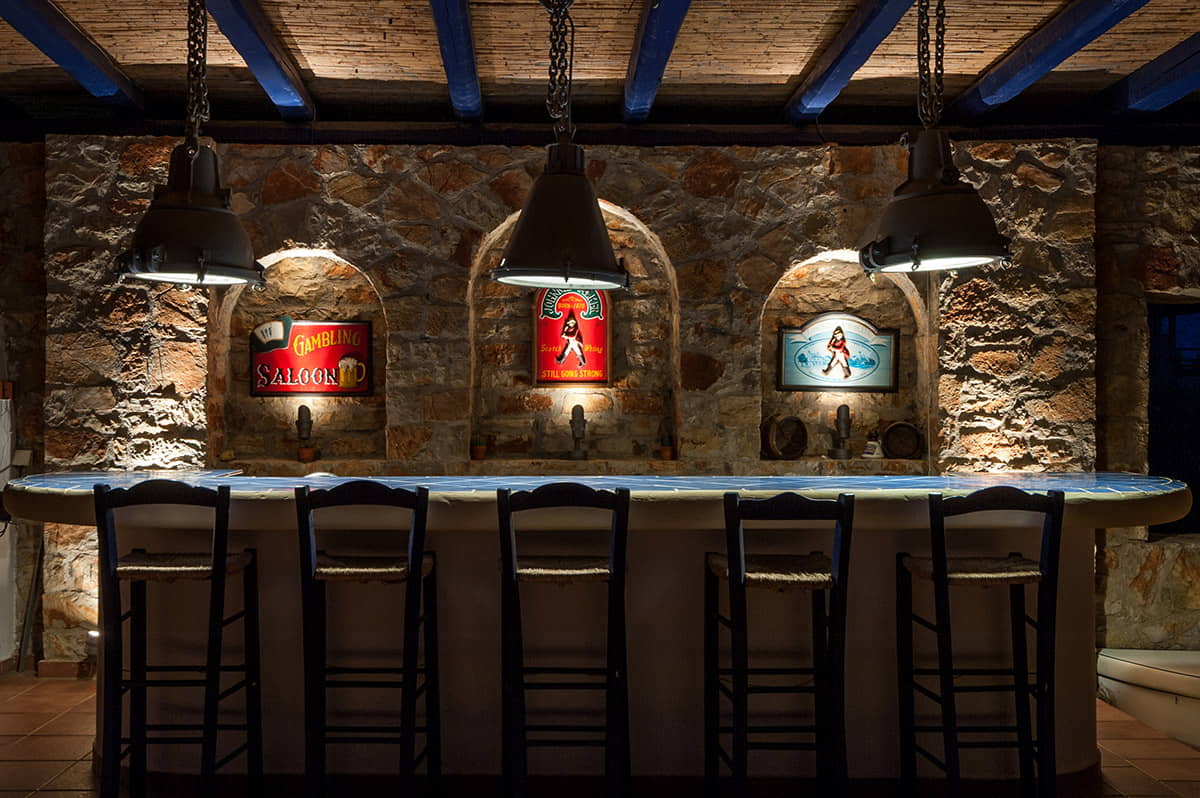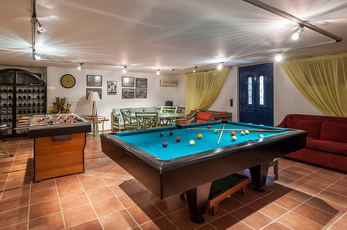 - The Main Villa: 3 junior suites (each with en-suite, kitchenette, king bed & sofa bed), 2 garden-level suites with single beds & sofa beds. Includes the main kitchen, spacious living area, indoor/outdoor dining, playroom, guest WC, wine cellar & staff rooms.